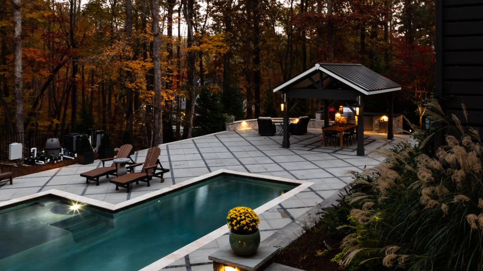 Outdoor space in Fuquay-Varina, NC, with pool, pavilion, outdoor lighting, and trees.