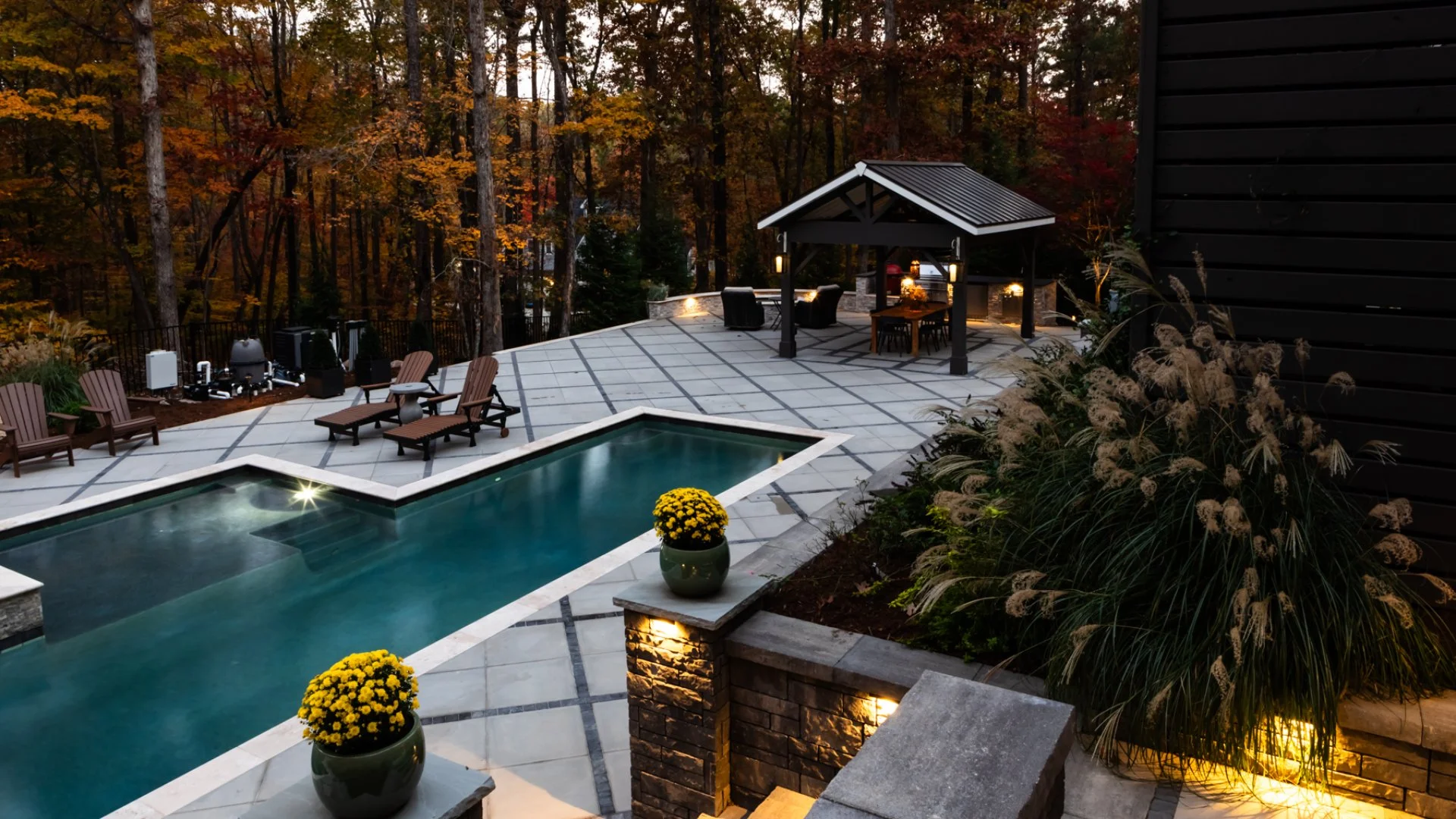 Outdoor living space with pavilion and outdoor kitchen on a property in Youngsville, NC.